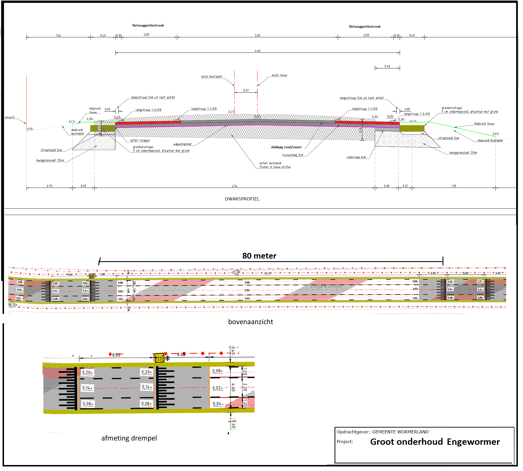 Wat gaan we doen: vervangen asfalt + aanleg verkeersplateaus elke 80 meter. Rode fietssuggestiestroken van 120 cm breed. De max snelheid blijft ongewijzigd.